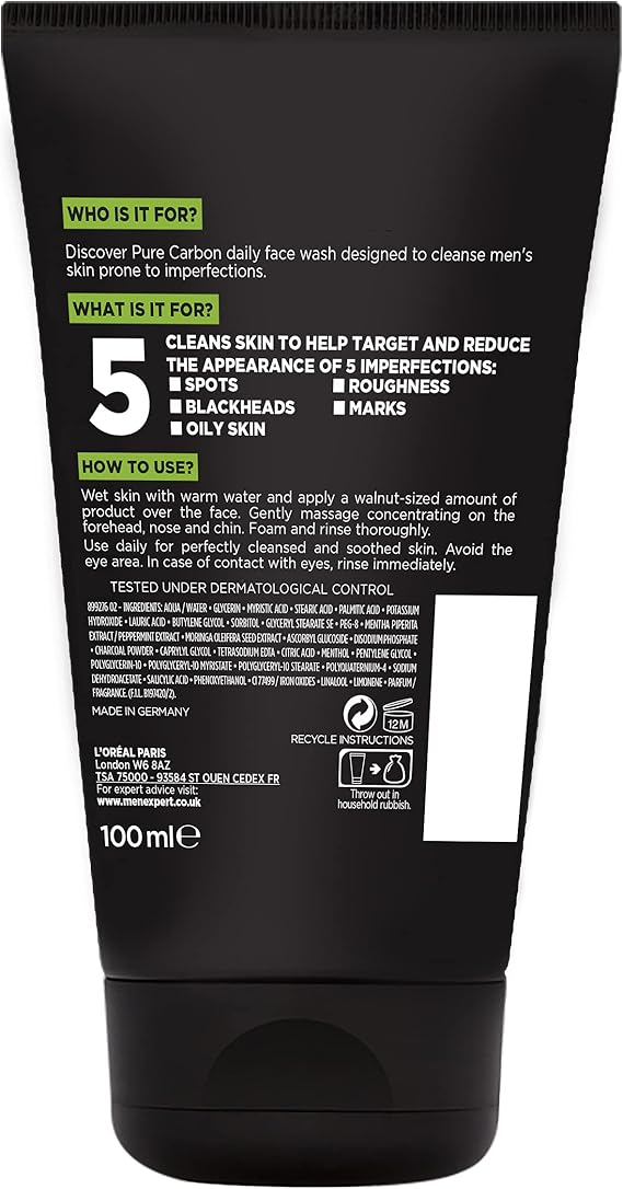 L’Oreal Men Expert Pure Charcoal Purifying Daily Face Wash deeply cleanses. It removes dirt, excess oil, and impurities from skin daily. Infused with charcoal, it draws out toxins for a clearer complexion. The formula helps fight breakouts while keeping skin hydrated and smooth. Suitable for daily use on all skin types.